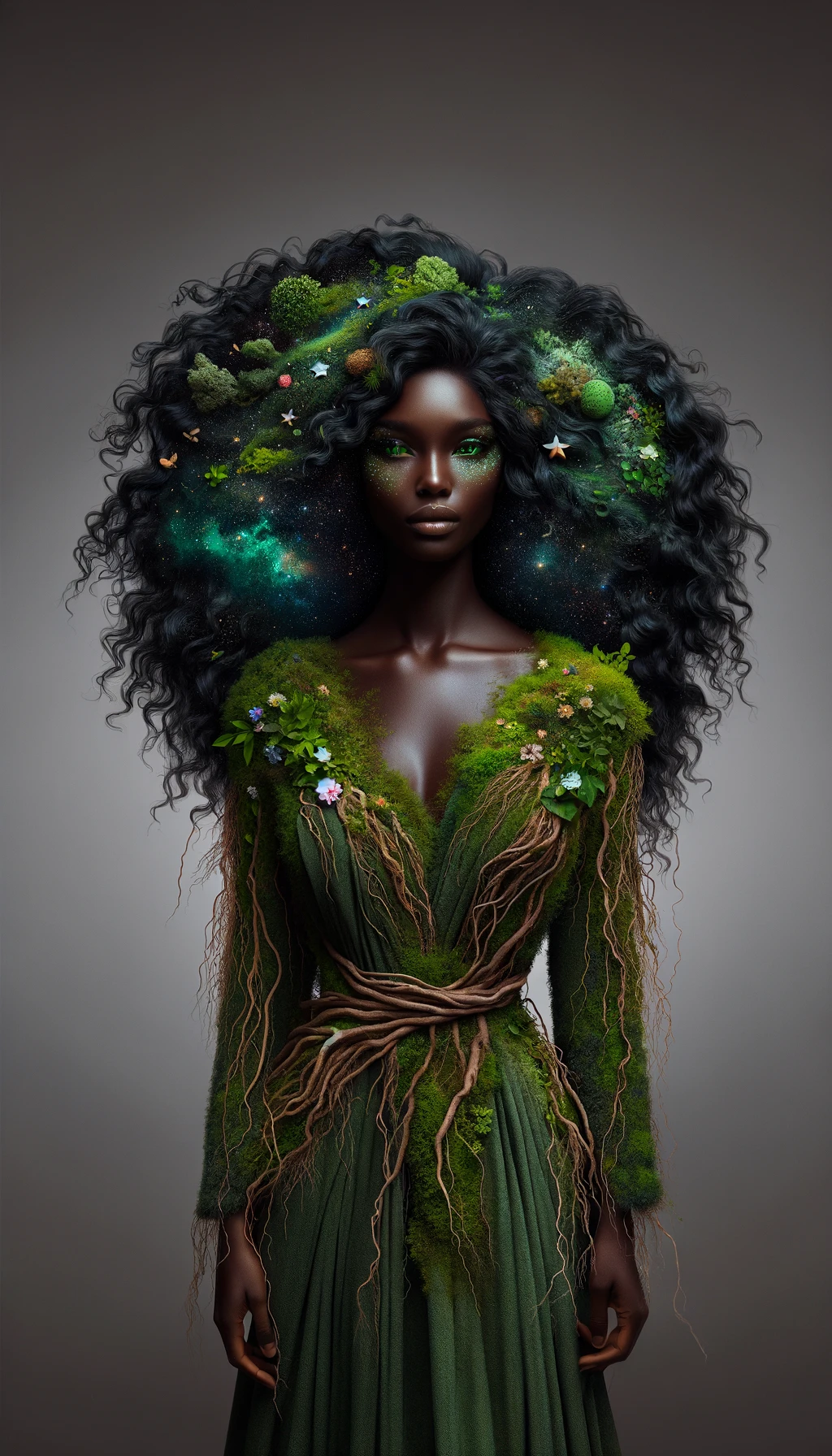 Her complexion, bearing the hues of Olympus, reflects her connection to the planet. Her eyes, a captivating shade of blue, reflect the wisdom and depth of her eternal gaze. Her hair forms a mesmerizing tapestry of black, gray, and white, flowing down to her waist. Adorned with a simple crown sculpted from stone, Gaia’s attire consists of verdant greenery that cascades gracefully over her form. Leaves sway gently in the breeze, cradling delicate flowers that bloom at her hips and shoulders, symbolizing her profound connection to nature and the cosmos.